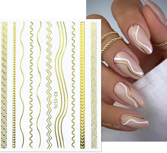 12 Sheets Gold Nail Stickers, 3D Self-Adhesive Metal Geometric Stripe Wave Nail Sticker, Gold Nail Art Designs, Style-c