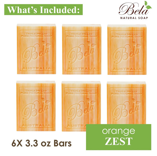 BELA Orange Zest Soap Bars 3.3 OZ Pack of 6, French Triple Milled Bar Soap with Organic Shea Butter Soap Bar for All Skin Types Long Lasting, Made in Australia