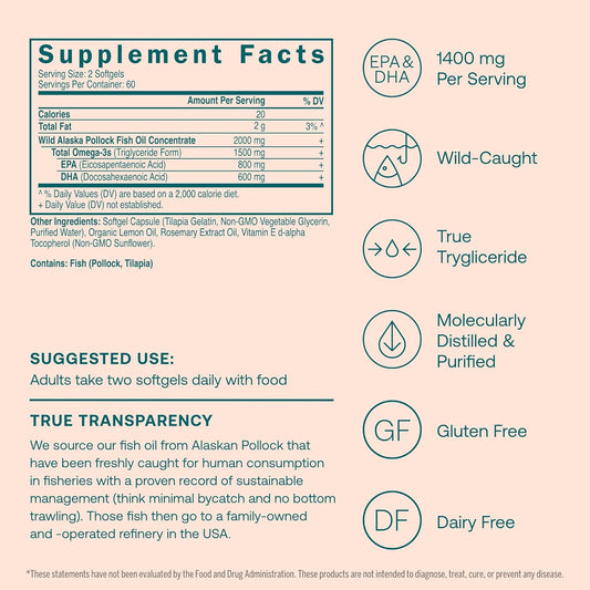 True Grace Omega-3 Fish Oil - 120 Softgels - 1400 mg EPA + DHA - Brain, Heart, Joint & Immune Health - Organic, Gluten Free, Soy Free