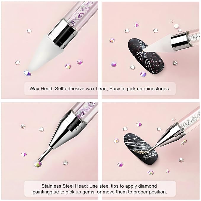 - Dual-end rhinestone picker: the adhesive wax tip is for pickup rhinestones and the stainless steel tip move them to proper nail surface positions. meet with all your diy nail crafts needs.