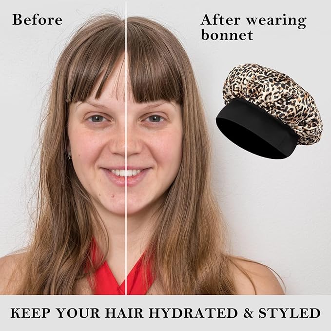 - WHAT YOU GET: 2Pcs silk bonnet for sleeping(black leopard). Our worry-free 30-day warranty, and friendly customer service.
