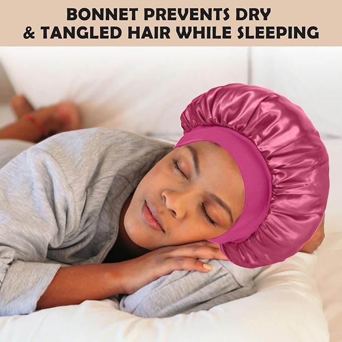 - PROTECTING HAIR: Silk sleep caps can greatly reduce the friction of the hair, and reduce the dryness, fork, and hair loss of hair. Will not bleed on the pillow. Do not need to clean up the pillow and sheets and the ground on the ground. Hair Bonnets for sleeping keep hair from knotting, protecting the luster and flexibility of the hair to the greatest extent.
