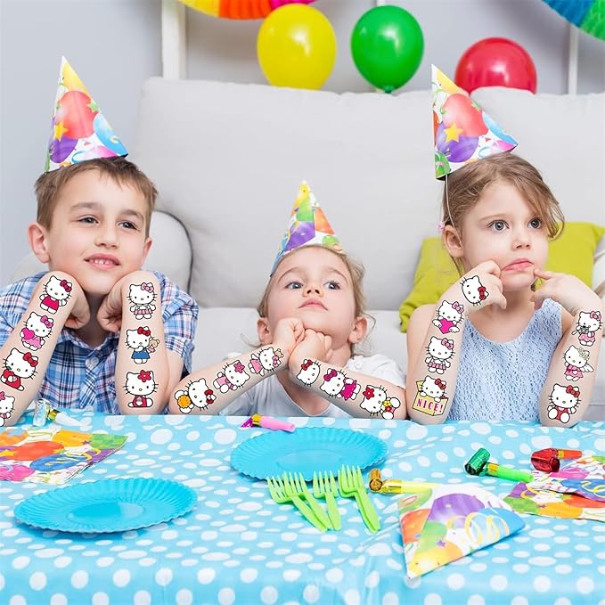 - Package Includes: 40Pcs Hello Kitty Temporary Tattoos with 20(2 of each) different designs and colors, each Temporary Tattoos measures 2” x 2”