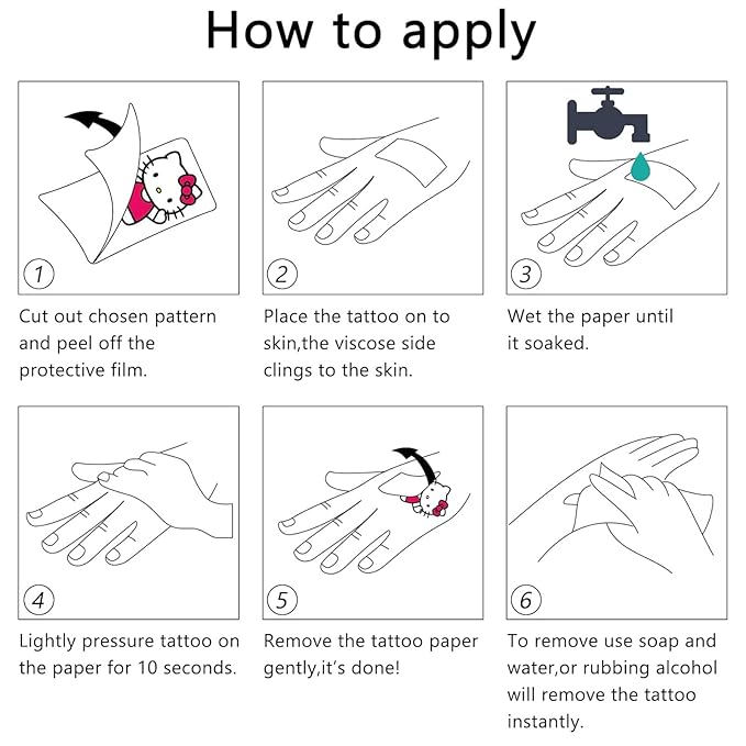 - Easy to apply: Cut out the desired motif and remove clear sheet > Place tattoo on clean + dry skin > wet the temp tattoo with water and wait for 10 seconds > Remove paper, allow tattoo to dry and enjoy