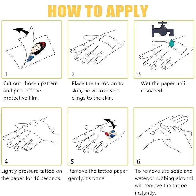 - 【Easy to apply】Cut out the desired motif and remove clear sheet > Place tattoo on clean + dry skin > wet the temp tattoo with water and wait for 10 seconds > Remove paper, allow tattoo to dry and enjoy!