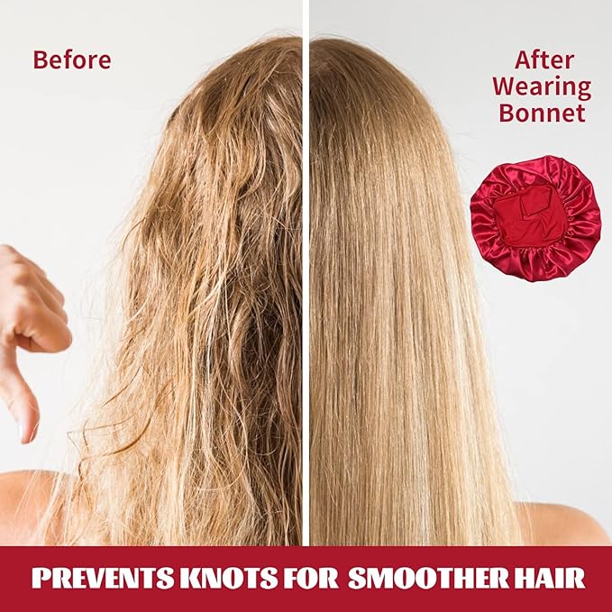 - HIGH-QUALITY: This silk bonnet for hair is made of high-quality satin. The touch is soft and smooth, bringing you the ultimate wearing experience. Satin bonnet for women will not slip easily, and let you sleep all night. Soft Elastic Band will not leave traces on your forehead.