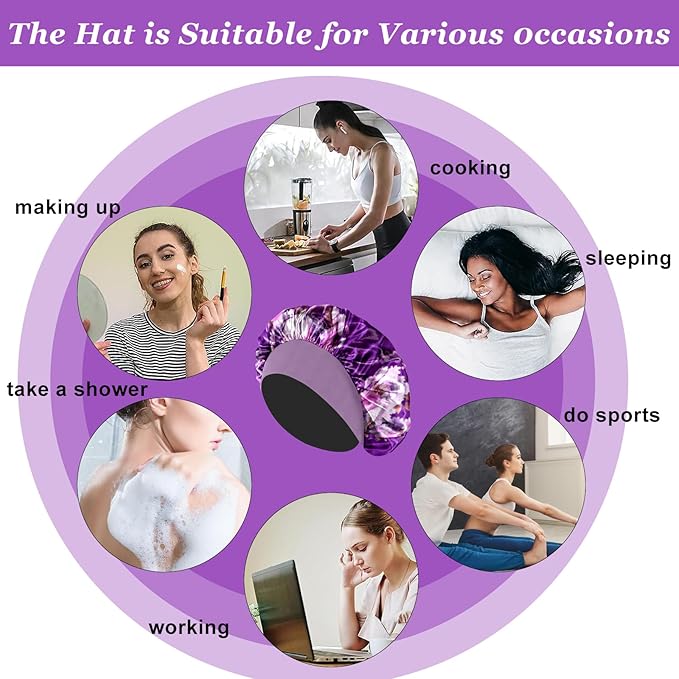 - 🌸【Useful】Silk Bonnet for Sleeping can wrap the hair well, after using the hair mask will not stain the bed sheet when sleeping, will not lose color.It can also be used as a shower cap to protect your hair from getting wet when bathing.You can wear it anytime. No matter makeup, cleaning, cooking, studying, working etc. It's lightweight, won’t add much extra weight on your head.