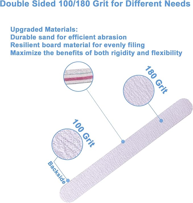 - 100/180 Grit Double Sided Nail Files: package includes 50 pieces of two sides nail files, where the coarse grit side of 100 is excellent choice for Acrylic Nails and thick nails, and the fine side of 180 grit is good choice for polishing the grease on the nail surface or for natural nails.