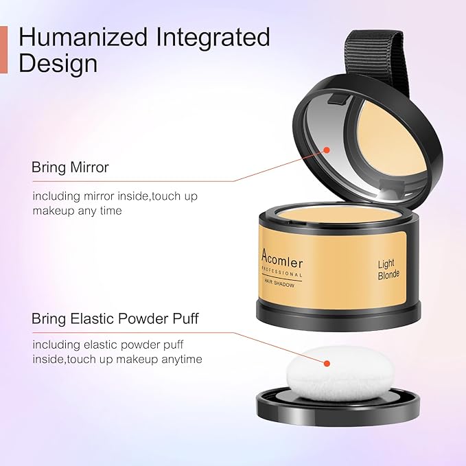 - 1.Instant Coverage Quickly Hair Root Touch Up -Acomler Hairline Powder puff can accurately cover the roots of hair. Locks on Until You Shampoo: Hair loss? Skip the embarrassing all-day touch-ups .The color is firm. Make the hair fluffy. Will Makes hair color natural and vibrant. Great for all hair types and texture!