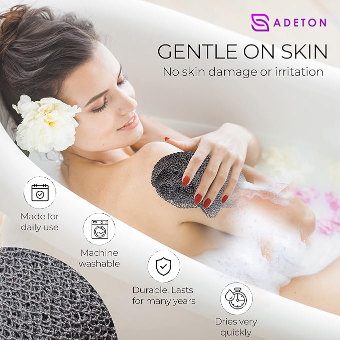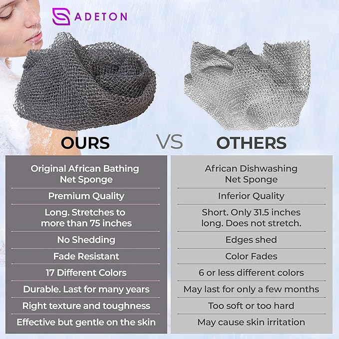 - Adeton African exfoliating net sponges are durable and reliable and will last for many years. They have strong soap lathering. They do not shed or fade and are machine washable. They have the right texture and toughness to give you that clean bath everyday.