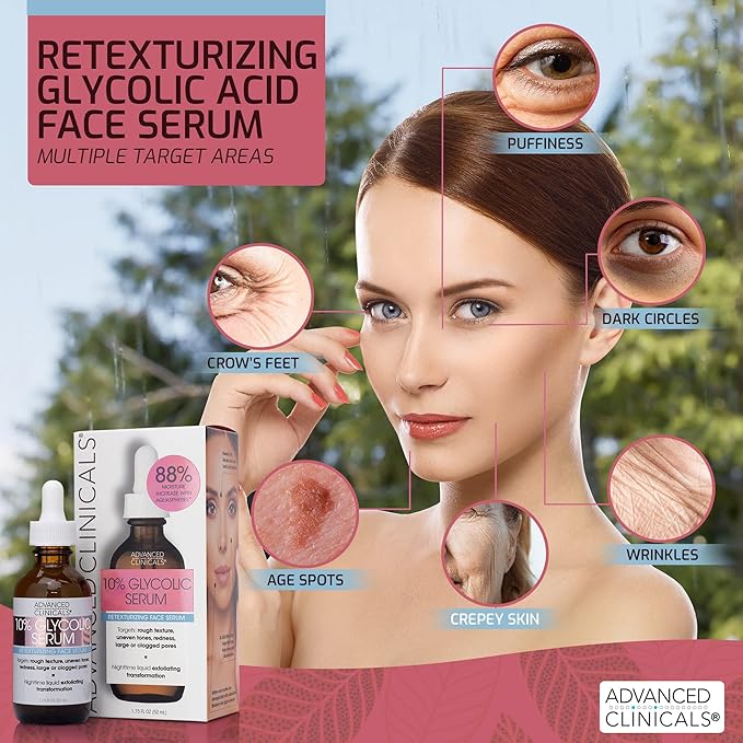 - EXFOLIATING 10% GLYCOLIC ACID SERUM – This Advanced Clinicals 10% Glycolic Acid serum exfoliates + resurfaces dull looking skin & boost skin cell turnover. Formula features 4 different exfoliating acids, Glycolic Acid, Salicylic Acid, Lactic Acid, & Phytic Acid. This Glycolic Acid Serum can rapidly diminish the appearance of Wrinkles, Uneven Skin Tone, Clogged Pores, Rough Skin Texture, Redness, Acne Scars, & Dark Spots. Removes dead skin cells to refine, plump, & smooth skin.