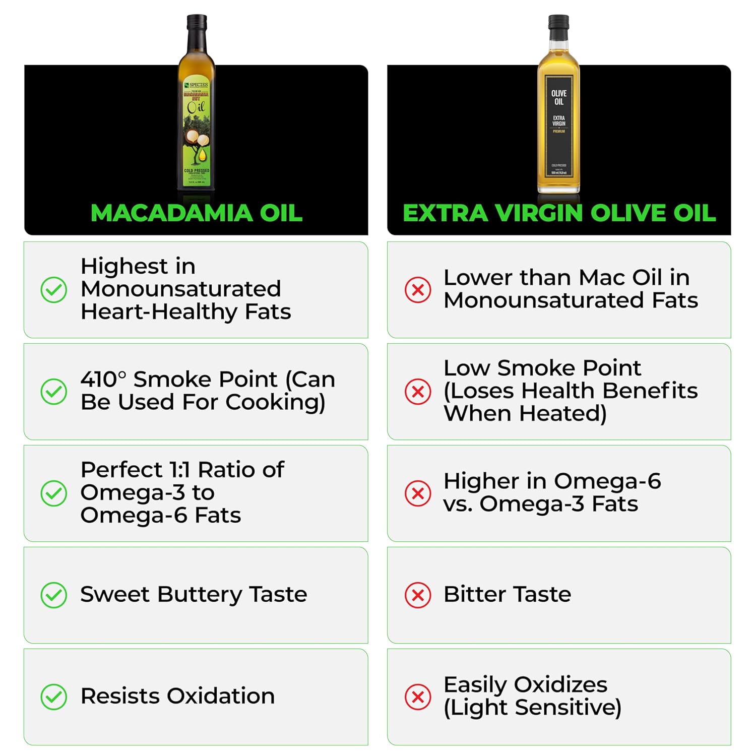 - PACKED WITH HEART-HEALTHY MONOUNSATURATED FATS. Loaded with 85% monounsaturated fats, macadamia oil provides a superior source of omega-9s (oleic acid) - even more than extra virgin olive oil. This makes it an ideal choice for heart health, metabolism support, and active lifestyles.