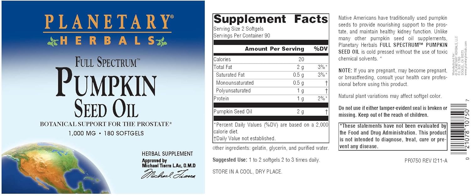 PLANETARY HERBALS Full Spectrum Pumpkin Seed Oil, Botanical Support for The Prostate*, 1,000 mg - 180 Count