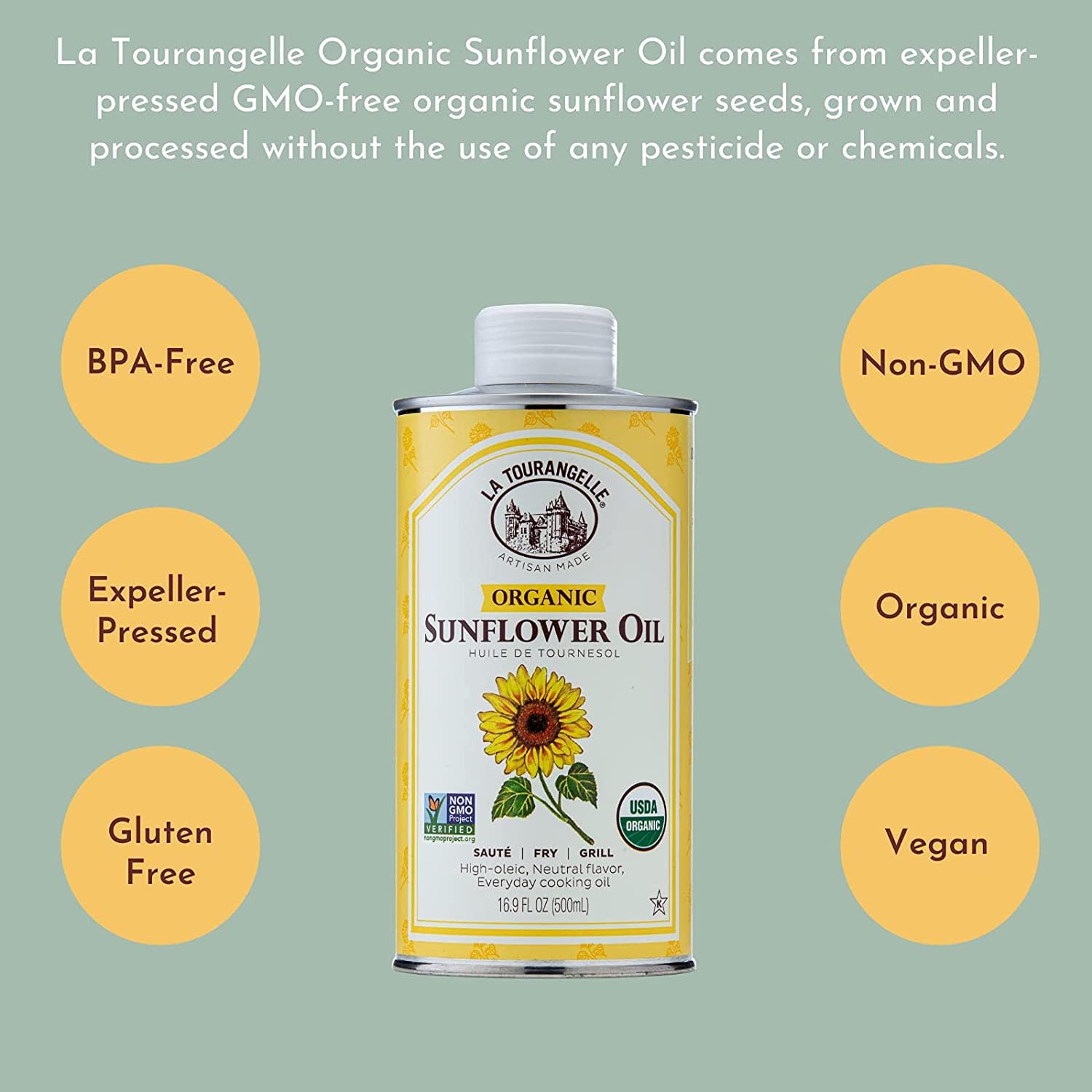 La Tourangelle, Organic High Oleic Sunflower Oil, Neutral Oil For Medium to High Heat Cooking and Skin Care, Non GMO, Pesticide and Chemical Free, 16.9 Fl Oz