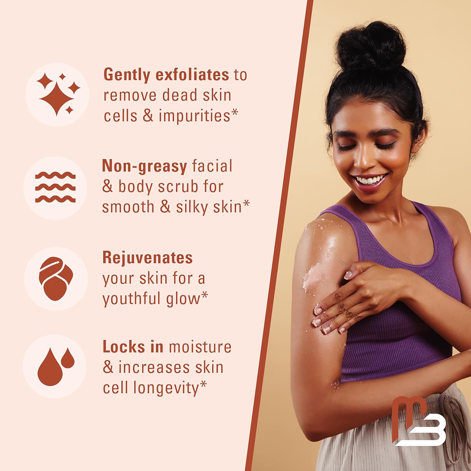 - M3 Himalayan Body Scrub: Enjoy the best exfoliating experience not only as a body scrub but also a facial scrub, hand scrub, or foot scrub. Moisturizing and rich in antioxidants, our Himalayan salt with Jojoba oil will help restore your skin while scrubbing away unwanted toxins and dead skin cells! *