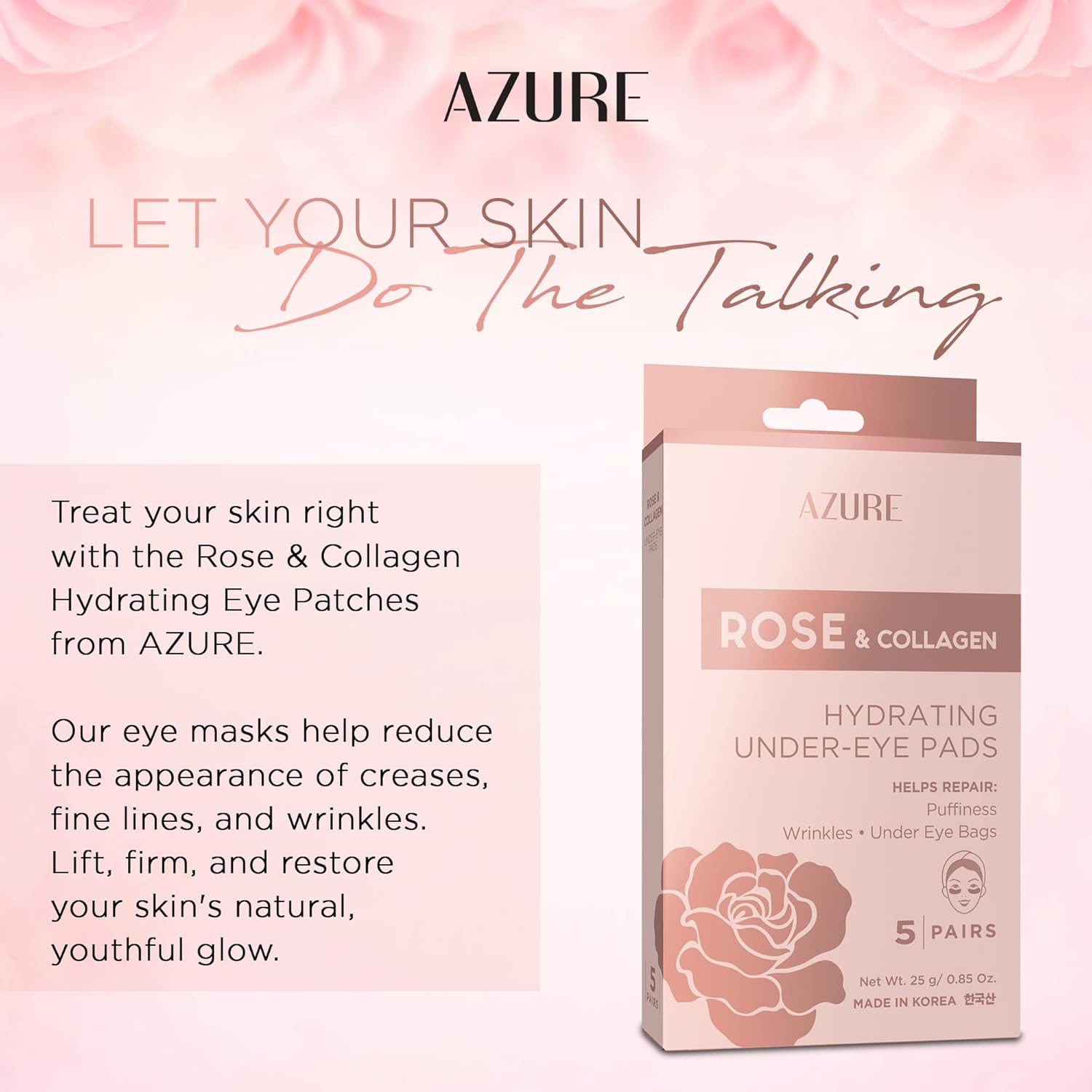 AZURE Rose & Collagen Hydrating Under Eye Pads - Anti Aging, Revitalizing & Moisturizing Eye Mask Patches - Reduces Fine Lines, Wrinkles, Dark Circles & Puffiness - Skin Care Made in Korea - 5 Pairs