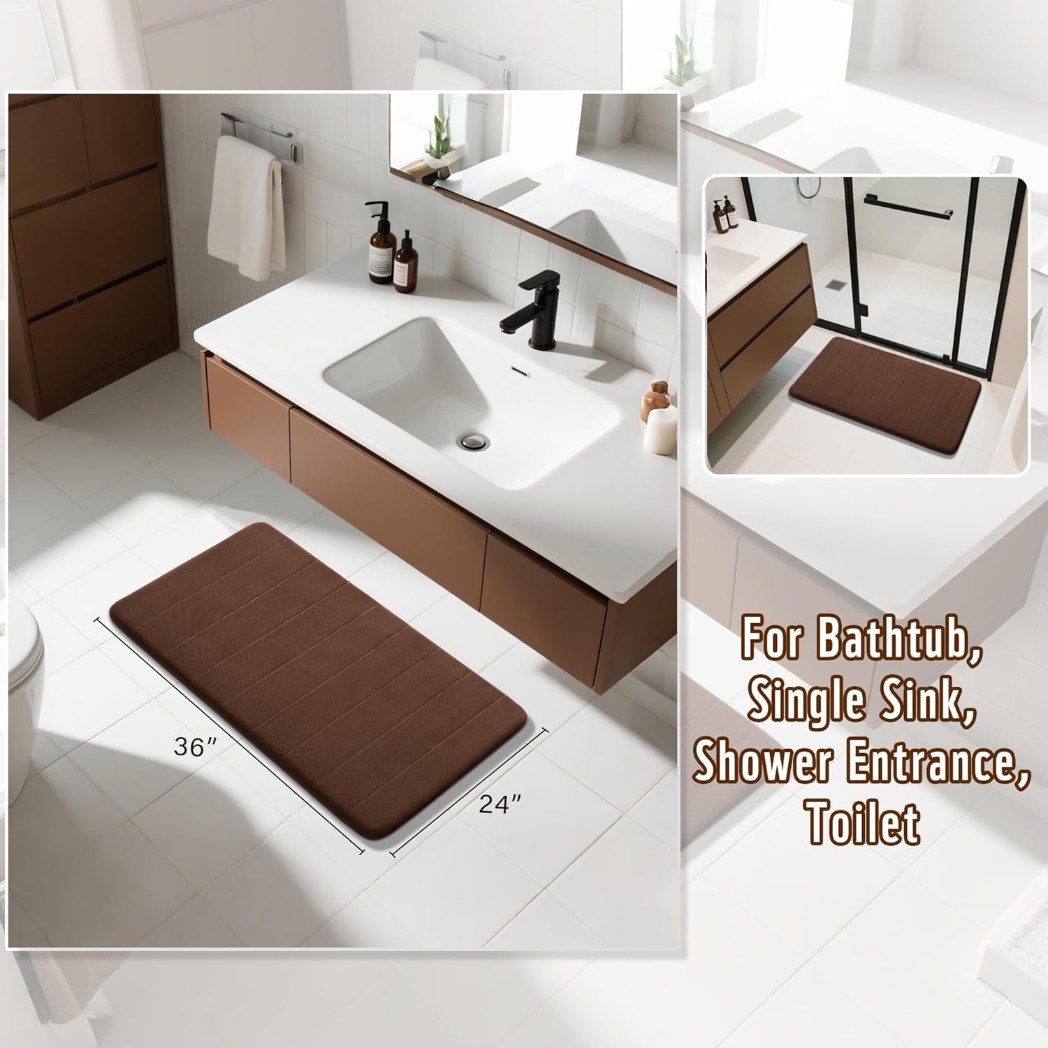 - 【Every Bathroom Hero: Custom Fit for All Spaces】This versatile product is not limited to one spot! Whether you need a non-slip guard for your bathtub or shower, a mat beside toilet, or a bathroom decor, it fits preeminently. The smaller sizes suitable for single-sink vanities, while the larger cover two-sink vanities, bathroom hallways, and even serve as reliable companions in the kitchen