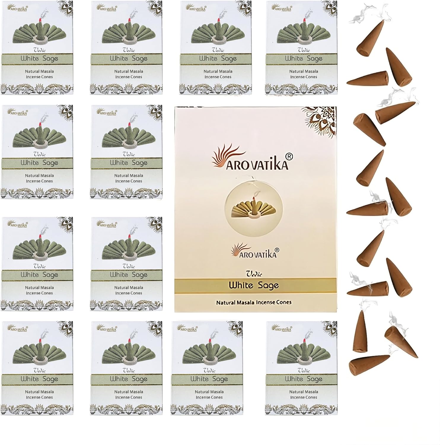 ARO VATIKA Vedic White Sage Natural Masala 120 Incense Cones in Pack of 12 Boxes| Best for Prayer, Reiki, Meditation and Relaxation | Burn Time- 25 mins