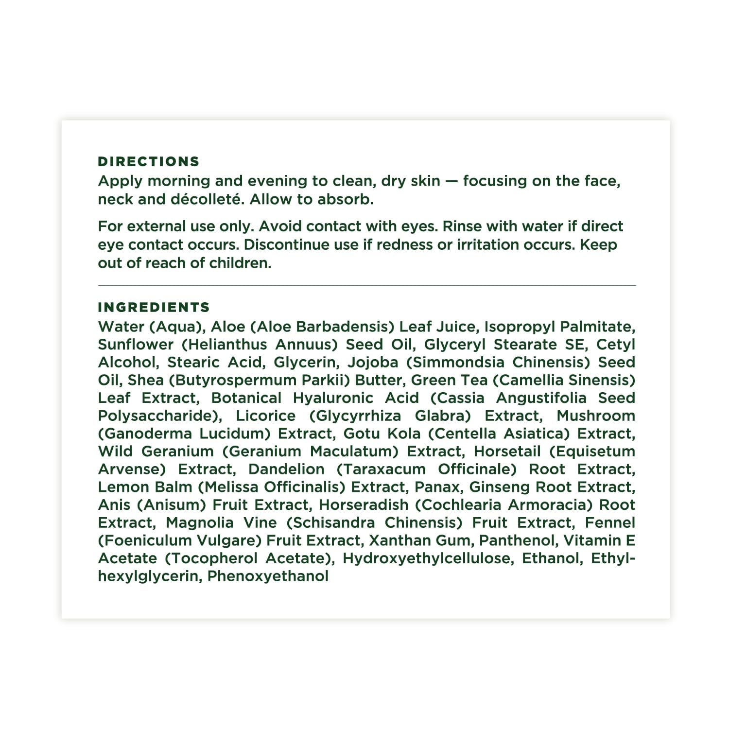 - Directions: Apply morning and evening to clean, dry skin — focusing on the face, neck and décolleté. Allow to absorb.
