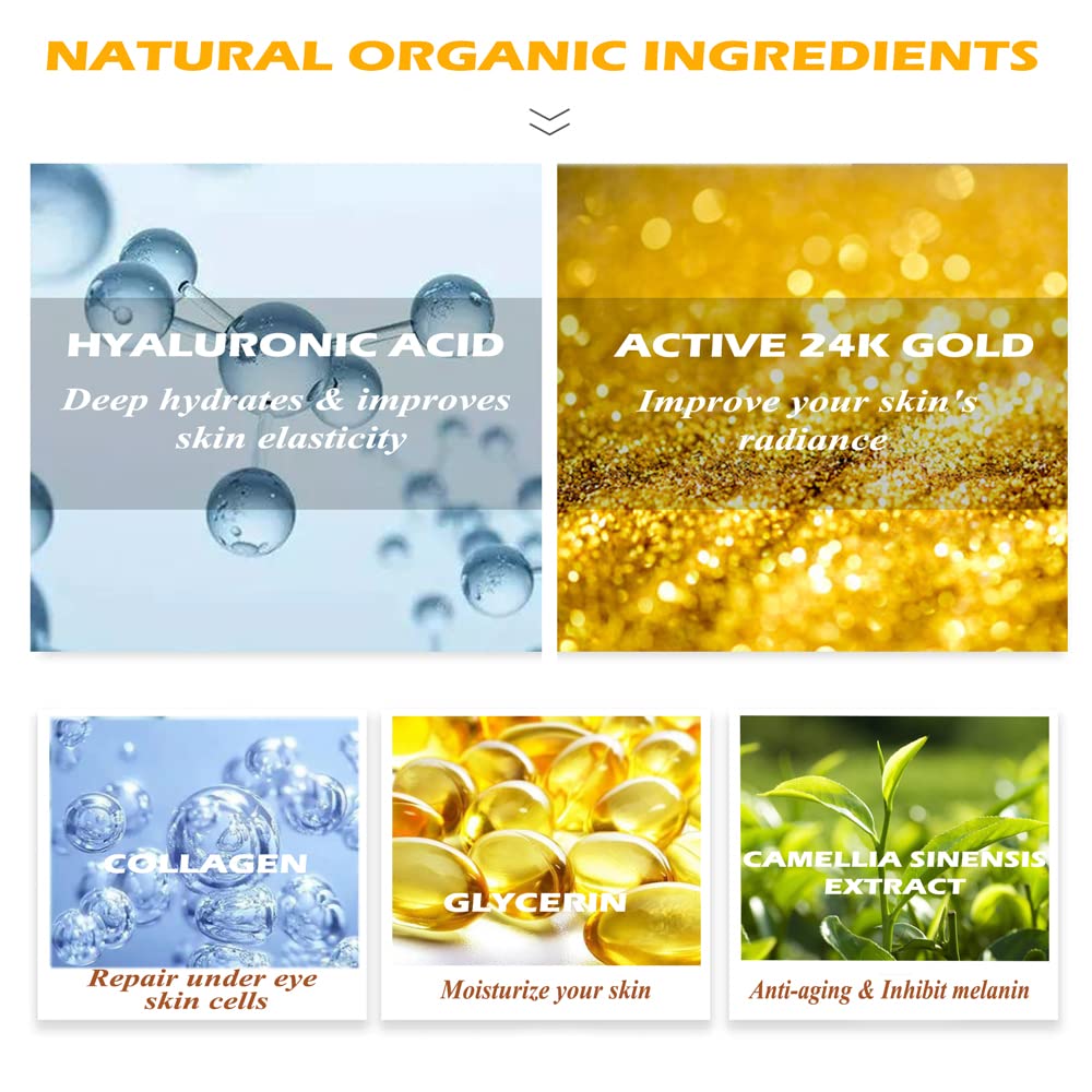 - ♥REPAIR UNDER EYE SKIN CELLS - Gold under eye mask is rich in collagen. It can effectively regenerates skin cells, dramatically elevate your own skins collagen growing ability. Restores skin elasticity and firmness. Reduces puffy eyes, fine lines, crow's feet, dark circles and eye bags.
