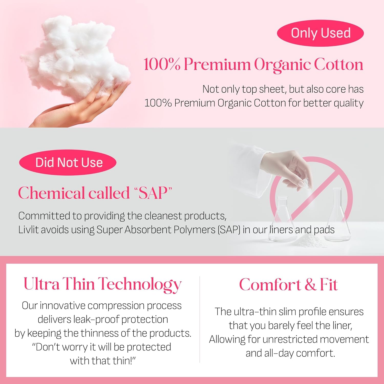 - SAP-FREE CONFIDENCE: Unlike traditional options, Livlit products offer SAP-free protection. Our advanced technology ensures you stay dry without superabsorbent polymers (chemical), delivering worry-free comfort and care.