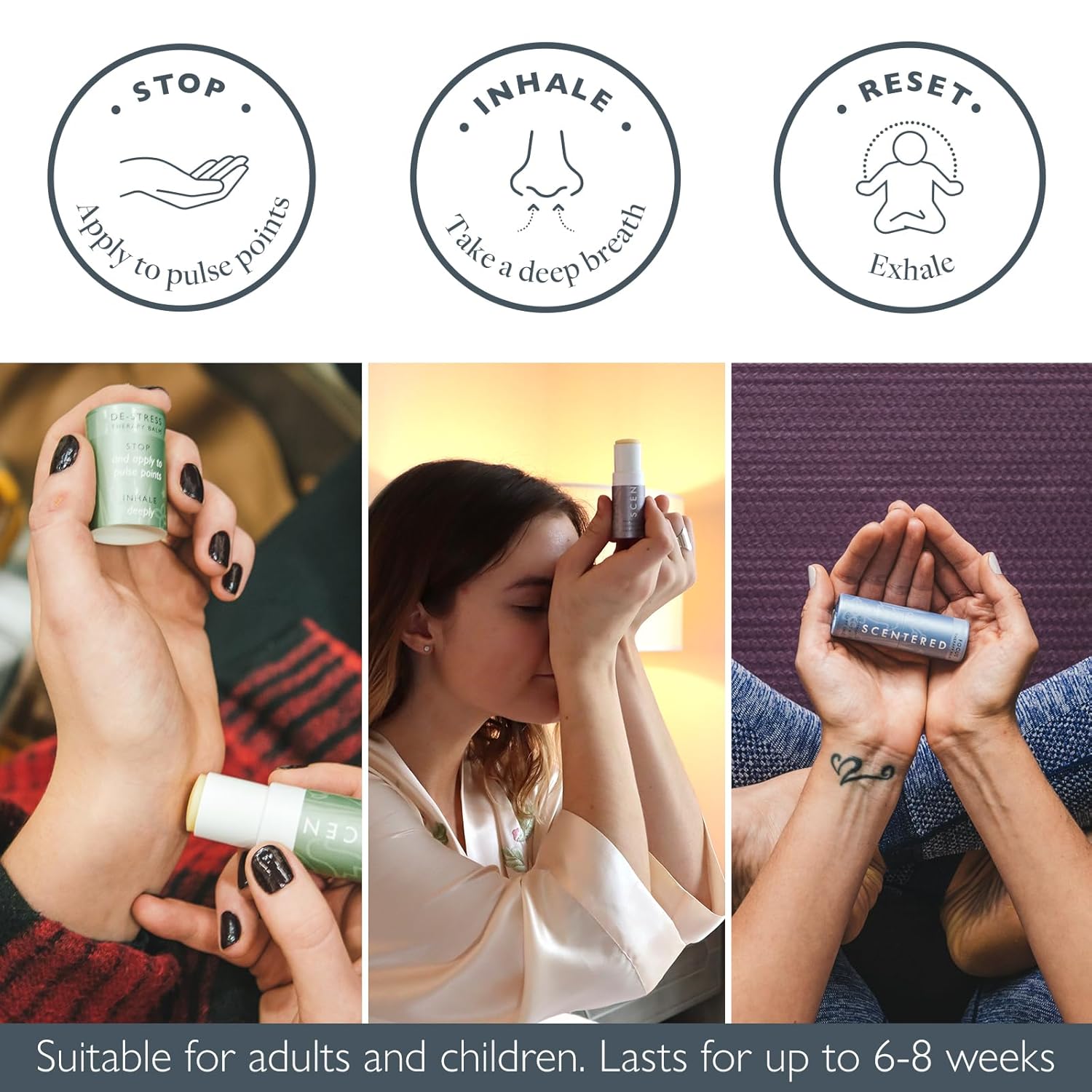 - Premium Essential Oil Blends: 100% Natural – 'Sleep Well' combines Lavender, Ylang Ylang, and Palmarosa as a natural sleep balm, 'De-Stress' blends Chamomile, Neroli, and Mandarin for anti-stress support, and 'Focus' features Rosemary, Mint, and Clary Sage for enhanced concentration. All balms are in a Shea Butter and beeswax base. Cruelty free and vegetarian-friendly.