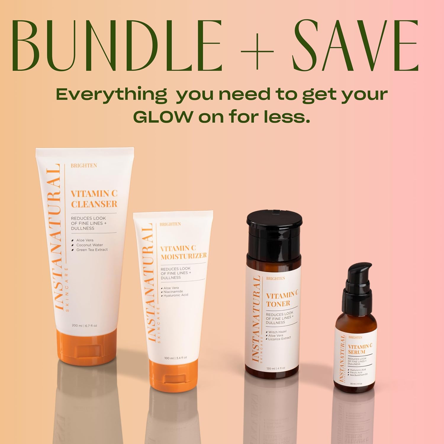 - It's Glow Time: This set features our most loved skincare essentials, our Vitamin C Cleanser, Toner, Serum and Vitamin C Moisturizer, a powerful skincare routine that brightens, hydrates and nourishes for refreshed and glowing skin