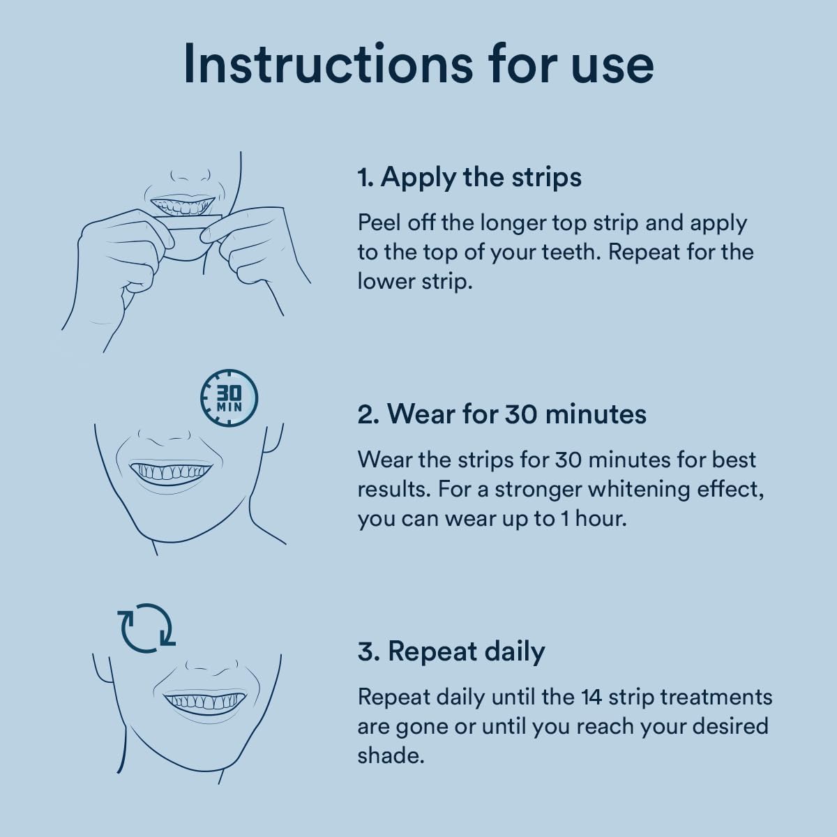 - [USE FOR 30 MINUTES PER DAY] For best results, we recommend wearing the strips for 30 minutes per day and avoiding eating or drinking 1 hour after use. For a deeper whitening effect, you can also wear the strips up to 1 hour per day.