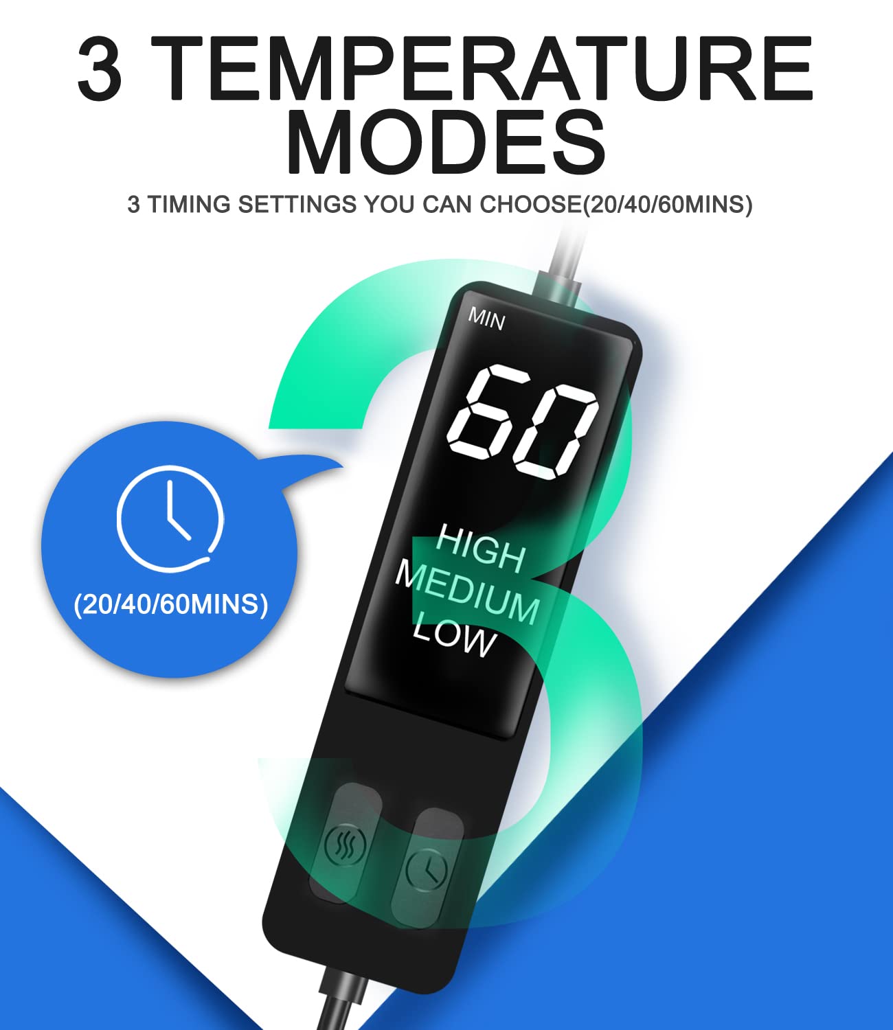 - The electrical heated eye mask was specially designed to have 3-class heat temperature settings from 104℉ to 140℉ and timing settings(20, 40 or 60 minutes). It will stop working automatically when time is up