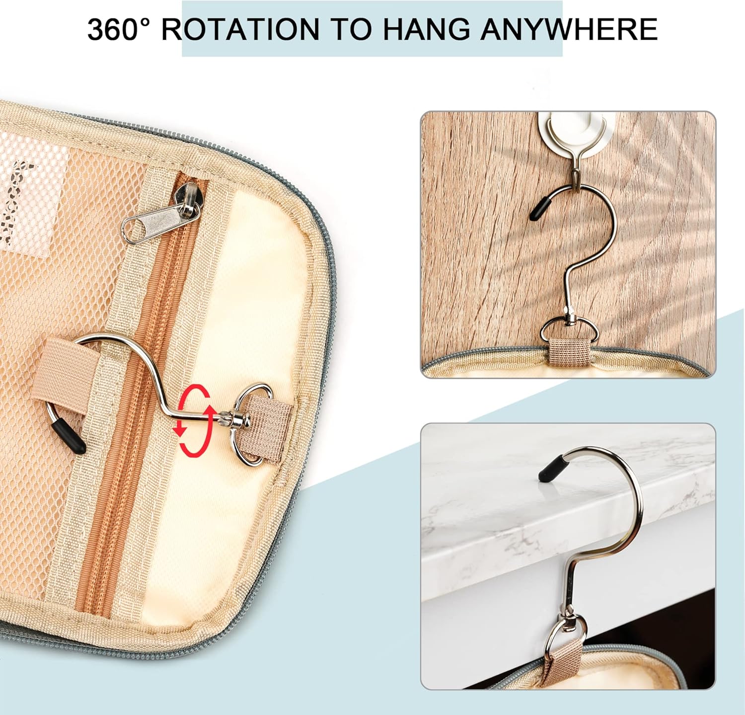 - ONSIDERABLE DESIGN - The elastic band and elastic mesh bag in the main compartment and two side compartments can keep the bottle fixed and upright. It has two waterproof compartments specially used for storing wet items. You can put your wet towel, toothbrush, shaving kit, and leaky cosmetics in it. The 360 degrees rotate metal hook gives you a variety of hanging options.
