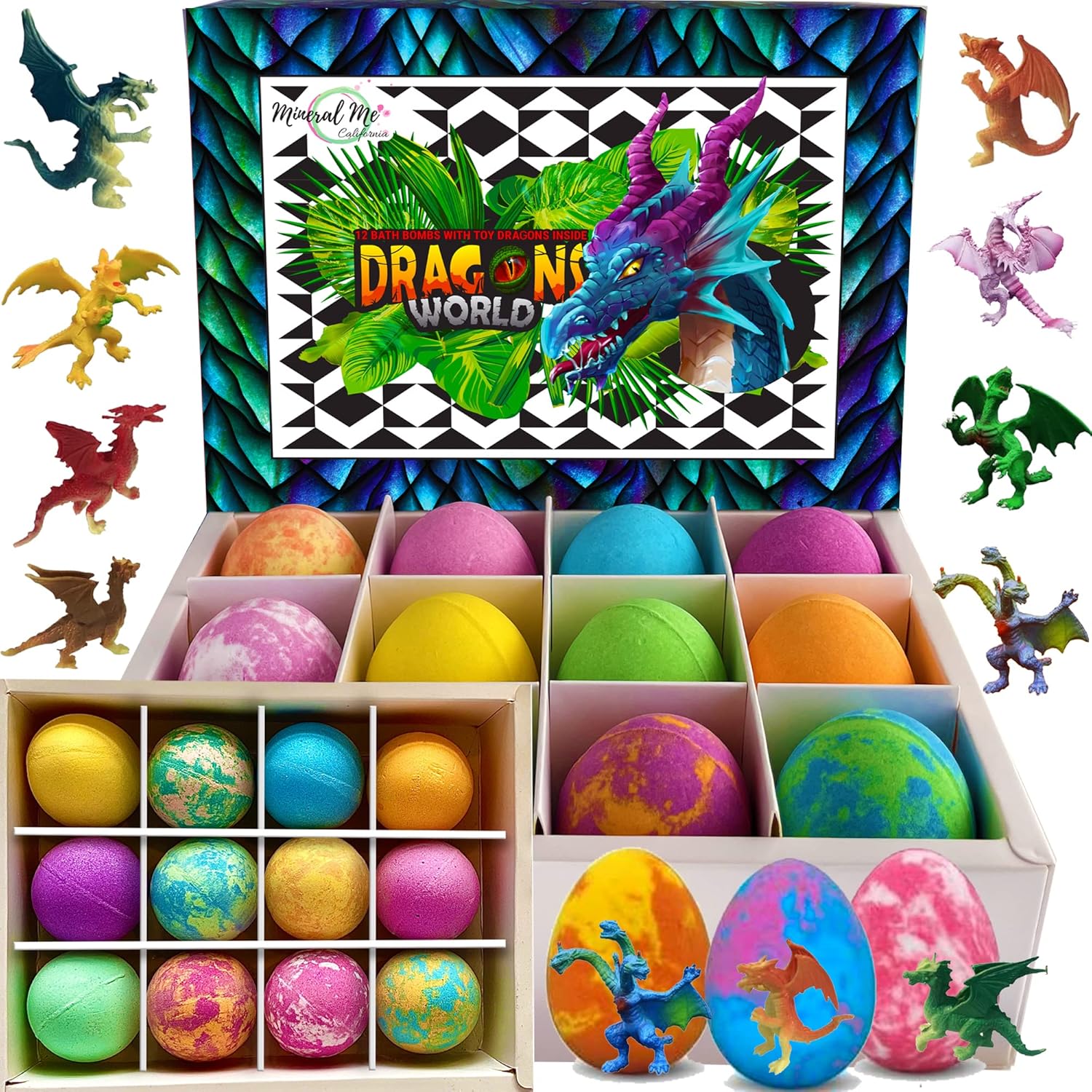 - 12 Colorful Kids Bath Bombs with Dragon Egg Toys . Your kiddo will love the colorful scented water, bubbly foam, and cute little surprise baby dragons inside.