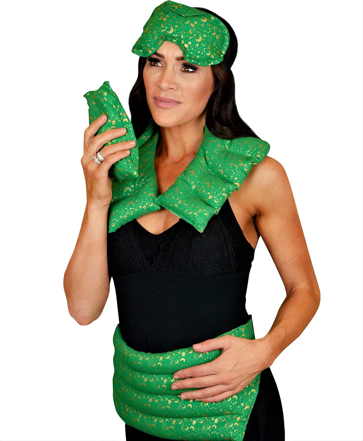 - AT HOME SERENITY: The full 4-piece set includes a wrap for the chest, neck, and shoulders, a belted lumbar wrap for the hips, abdomen, and lower back, an eye mask to relieve headaches and aching eyes, and an all-purpose aromatherapy pack