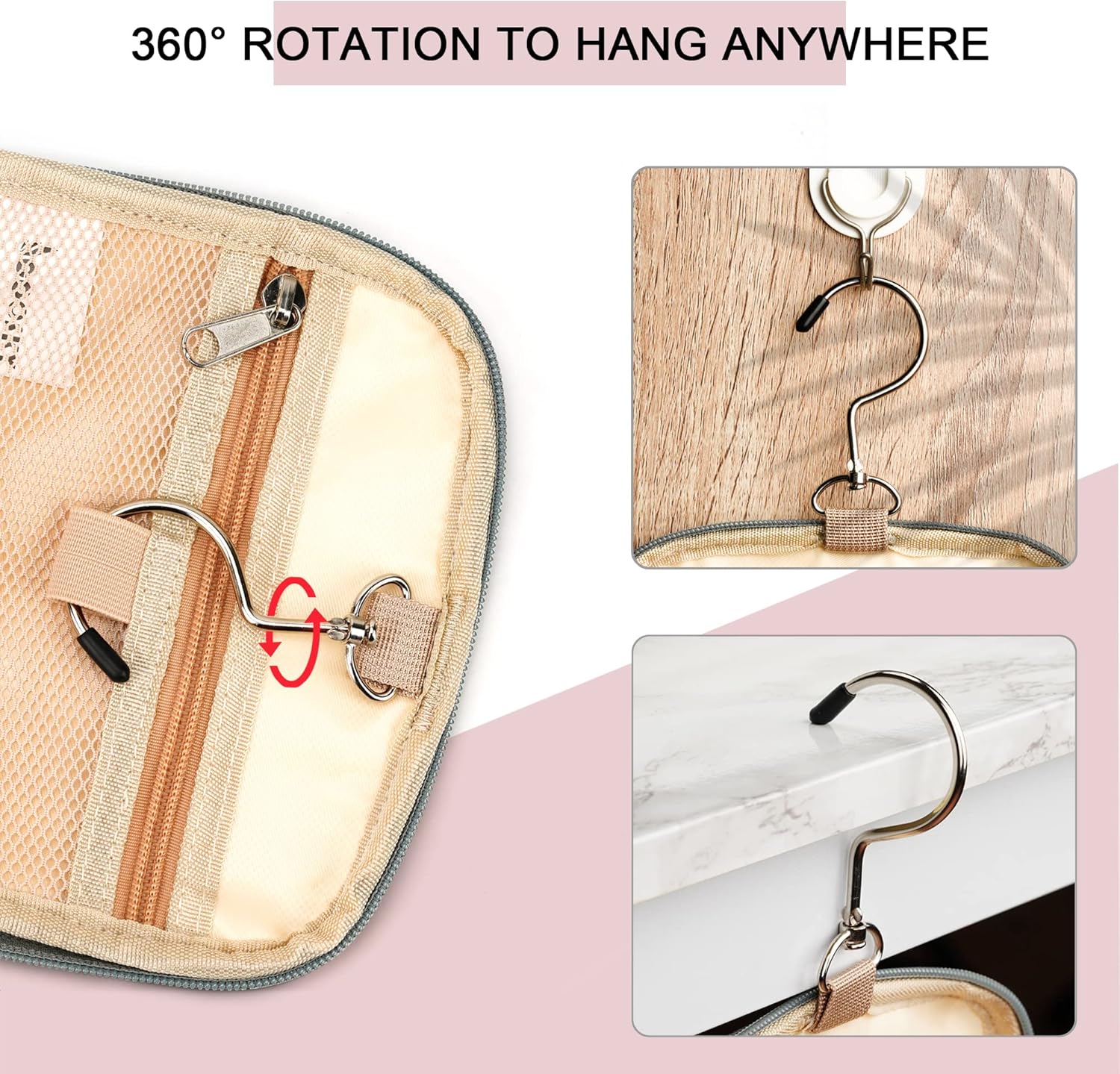 - CONSIDERABLE DESIGN - The elastic band and elastic mesh bag in the main compartment and two side compartments can keep the bottle fixed and upright. It has two waterproof compartments specially used for storing wet items. You can put your wet towel, toothbrush, shaving kit, and leaky cosmetics in it. The 360 degrees rotate metal hook gives you a variety of hanging options.