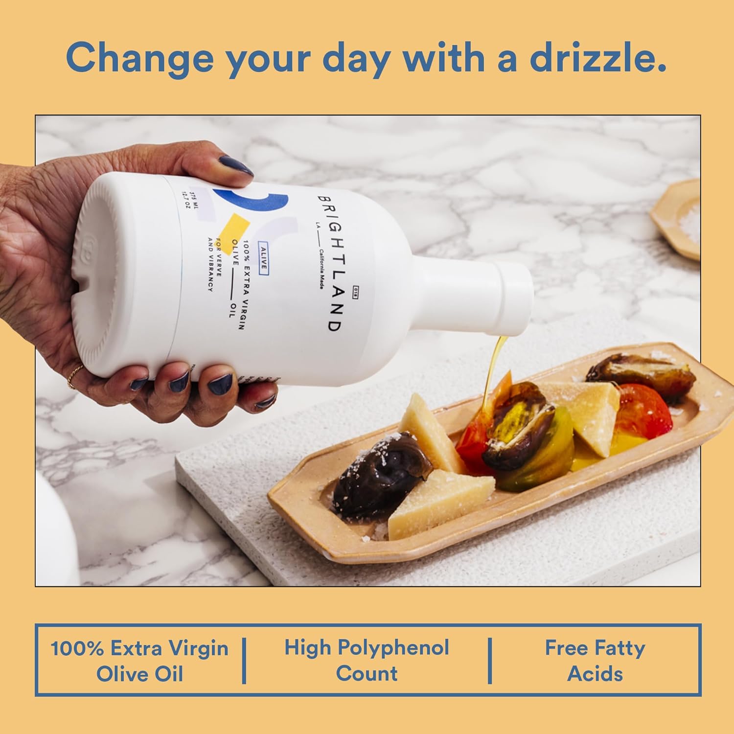 - Drizzle Something That Redefines Delicious: The Duo by Brightland features our bestselling foundational extra virgin olive oils, paired together to balance and complement every meal your kitchen dishes out. Packaged in fully-recyclable glass bottles that have been UV-coated to protect the olive oil from damaging light. Includes two 12.7fl oz. Bottles - one bottle of Awake and one of Alive.