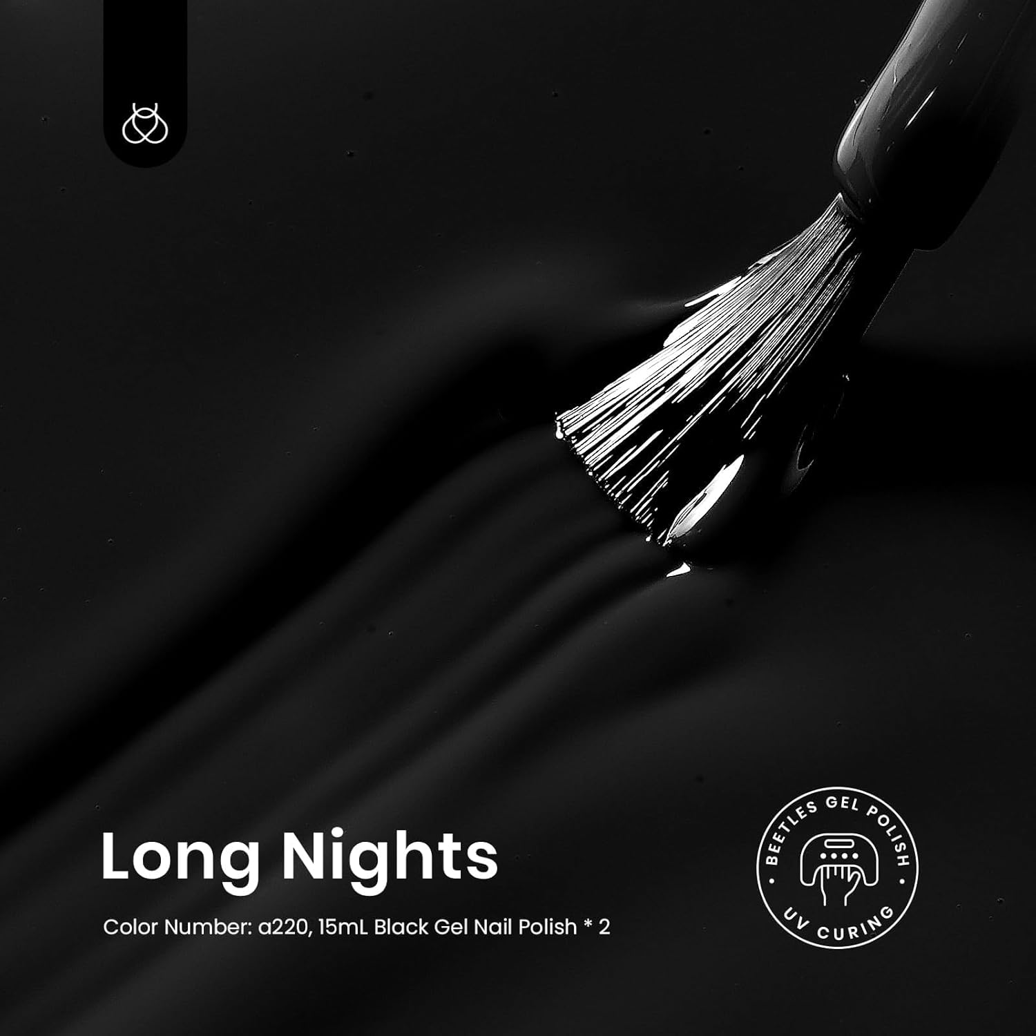 - Beetles Black Gel Polish: 15ml *2 Pcs bright black all-season gel polish set. Long lasting for 28+ days with a perfect shine. The black gel nail polish set is an ESSENTIAL for everyone! Color Number: a220