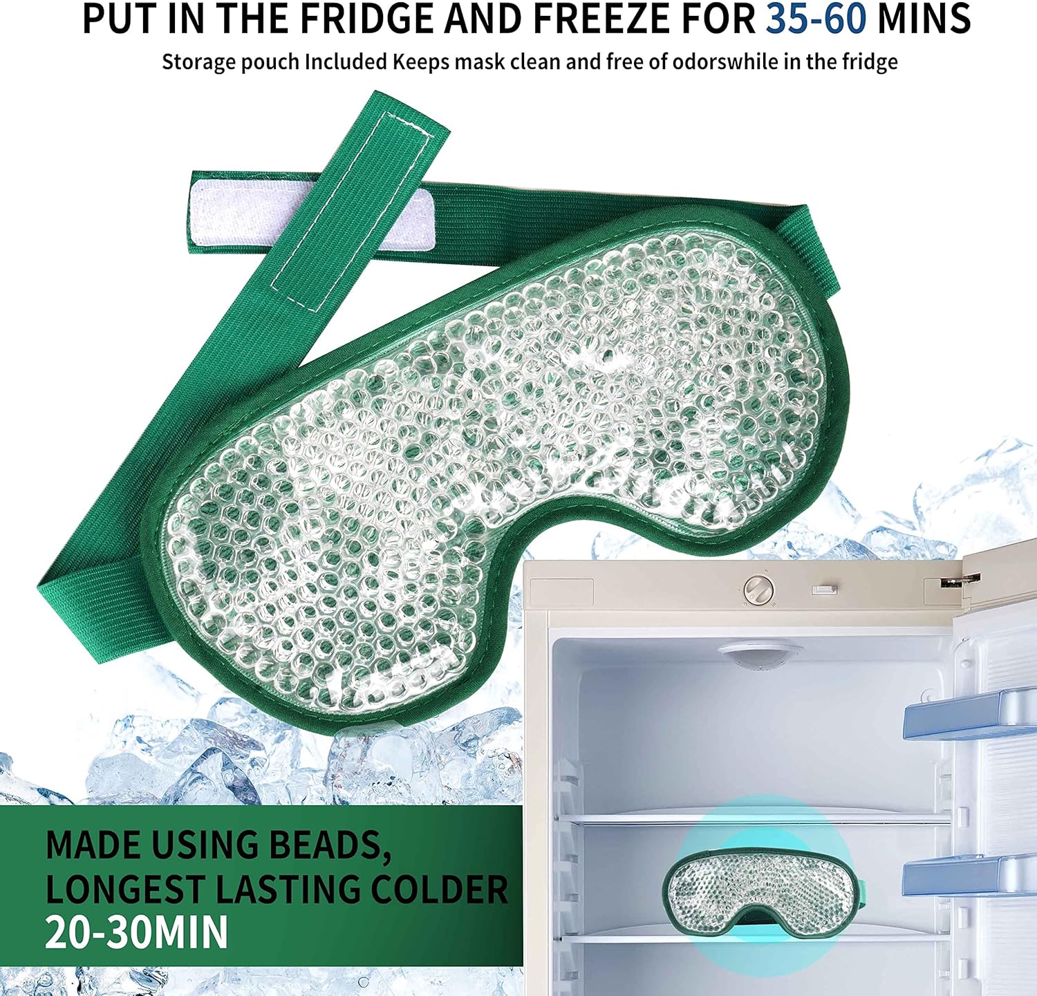 - RELIEVE DISCOMFORT: The gel bead eye mask is a quick and easy way to relieve your eye discomfort. Freezing the cooling gel eye mask and put it on your eyes to reduce puffiness from a night of poor sleep or a late night, or to relieve tired eyes that have been staring at a computer all-day