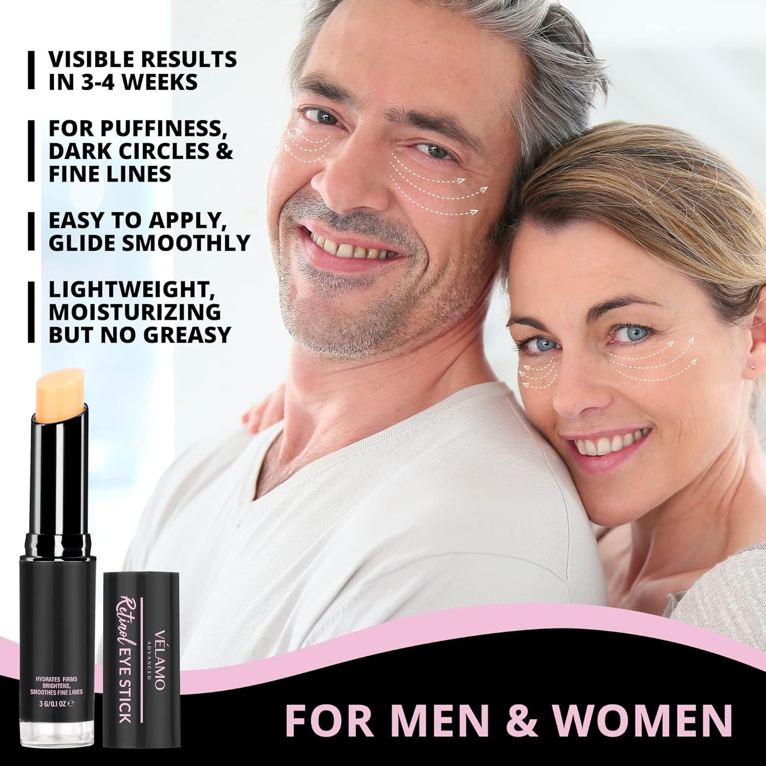 - ๐Clean, Vegan, and Effective Ingredients - Encapsulated retinol, power peptide complex, vegan squalane, and astaxanthin target signs of aging for a more youthful appearance. VELAMO ADVANCED under eye cream stick would gain peace for your eyes and confidence for you through beauty!