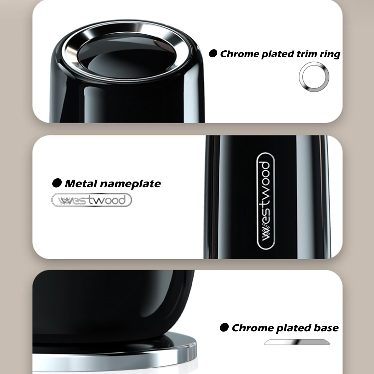 - 【Metal decoration】Metal film coating decoration with chrome plated trim ring on the head, metal nameplate on the body, chrome plated base at the bottom. The base helps it to stand up firmly