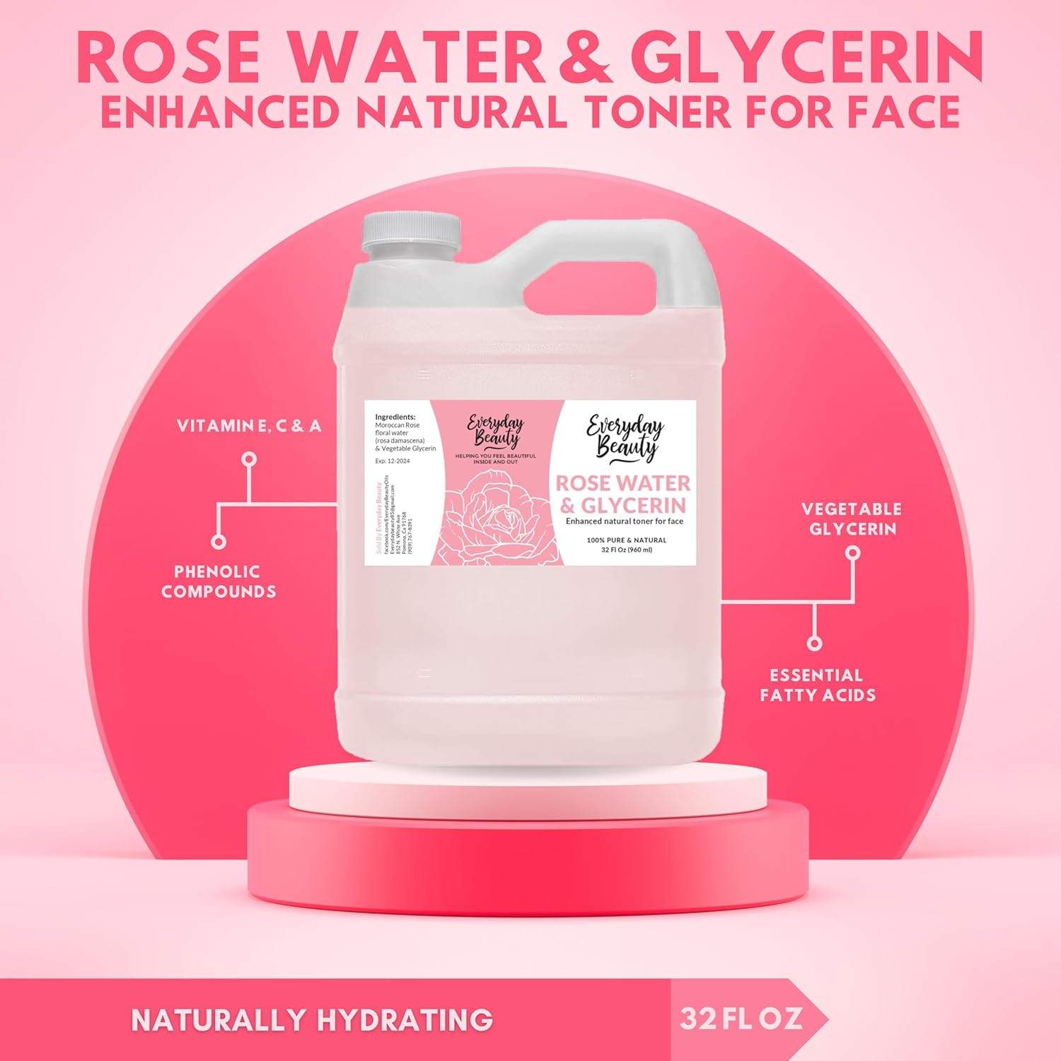 Rose Water & Glycerin Enhanced Facial Toner - 32oz Bulk Alcohol-Free Vegan All Natural Refreshing for Face and Hair - Uplifts, Calming & Soothing for All Skin Types…