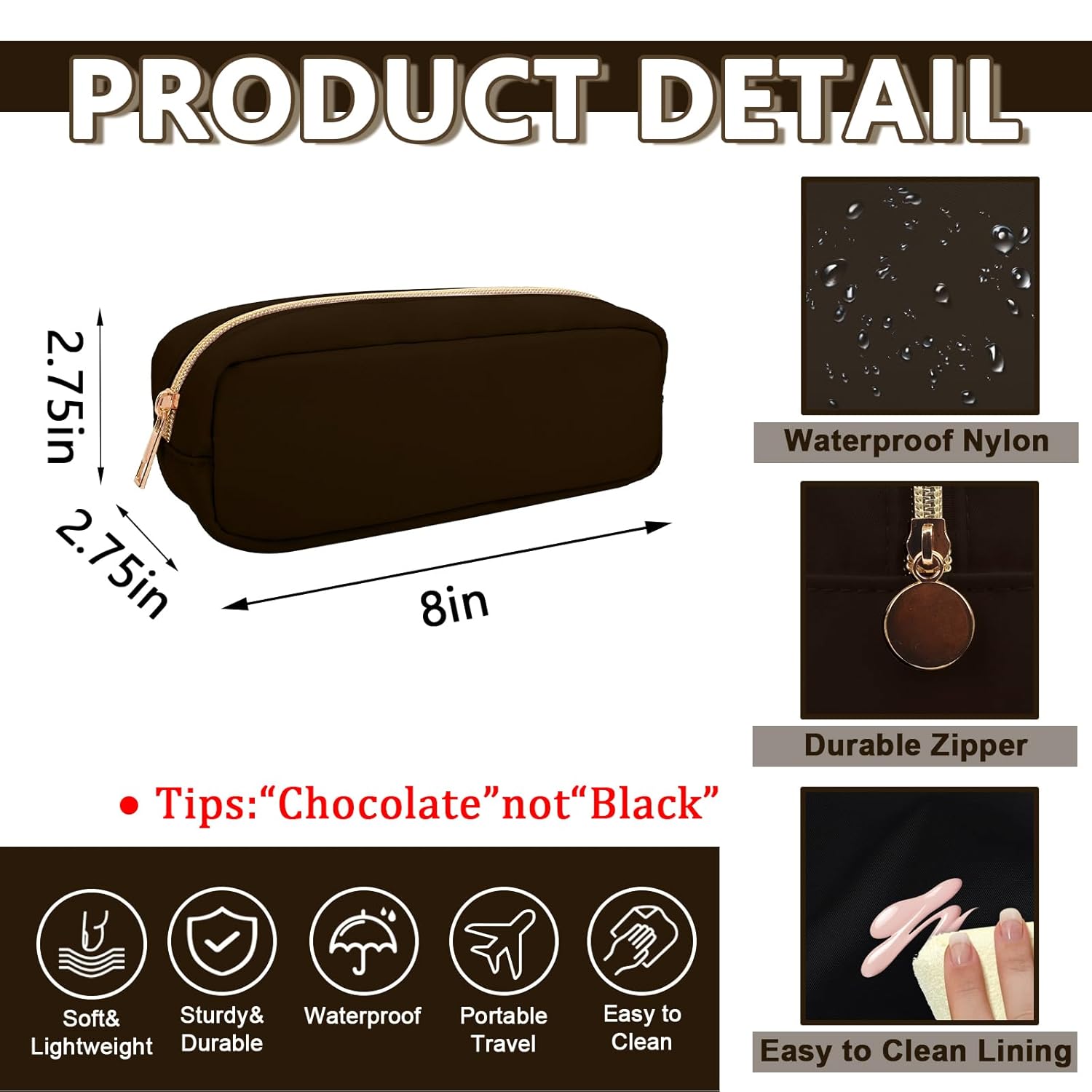 Small Pencil Case Makeup Bag for Purse, Cute Pencil Pouch Preppy Nylon Makeup Brush Bag with Zipper , Girls Portable Stationery Storage Case Small Pen Bag for Office School College(Slim-Chocolate)