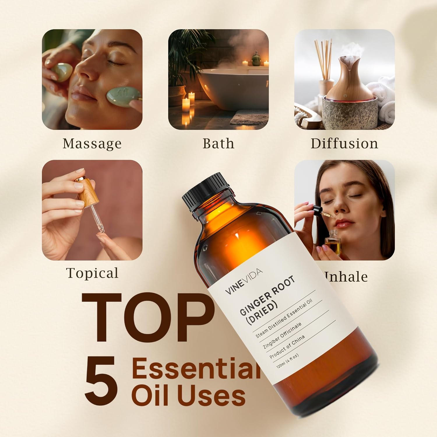 VINEVIDA Dried Ginger Root Essential Oil 4 oz - Undiluted Ginger Root Oil 4 oz - Ginger Root Candle Oil Scent - DIY Candle Scents for Candlemaking - Bulk Essential Oil for Soap Making Safe for Skin