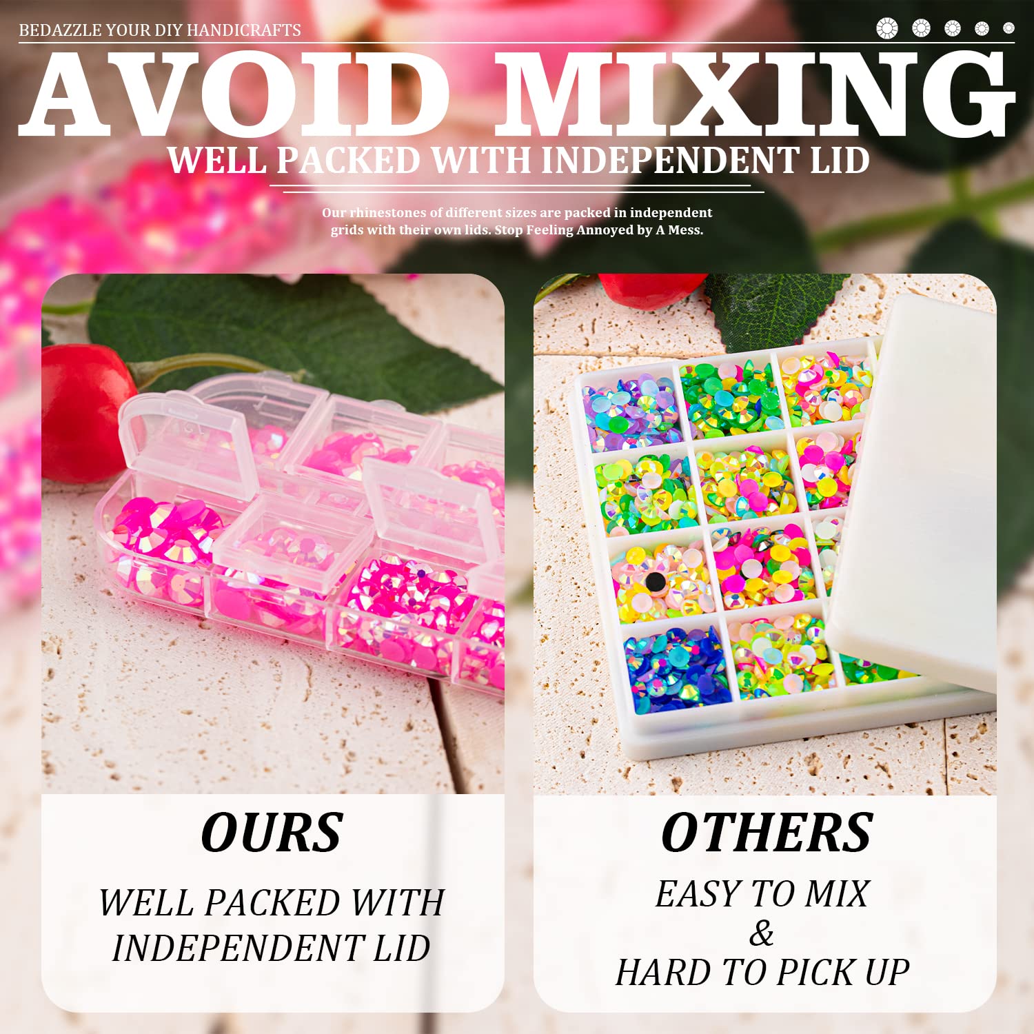 - ๐PACKAGE CONTENT -- This resin rhinestone kit includes 4 boxes, each with 12 grids, featuring a variety of sizes: Box #1/#2 contains 2mm x 1 grid, 3mm x 1 grid, 4mm x 3 grids, 5mm x 3 grids, and 6mm x 4 grids; Box #3/#4 contains 3mm x 3 grids, 4mm x 3 grids, 5mm x 3 grids and 6mm x 3 grids. A tweezer and a pickup pencil are included for easy rhinestone picking. This set offers more large-sized gems, making it perfect for DIY craft decorations, eye makeup, face makeup and nail art.