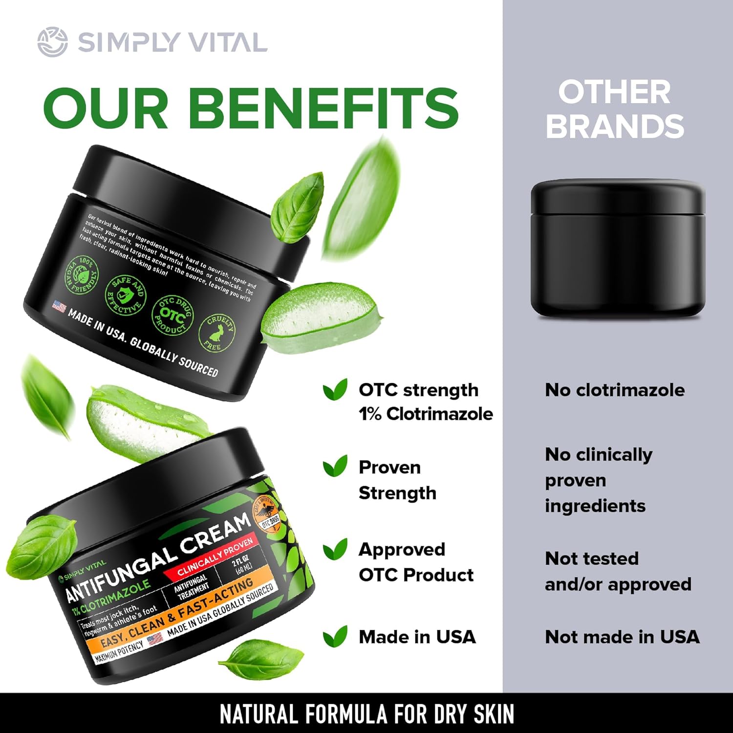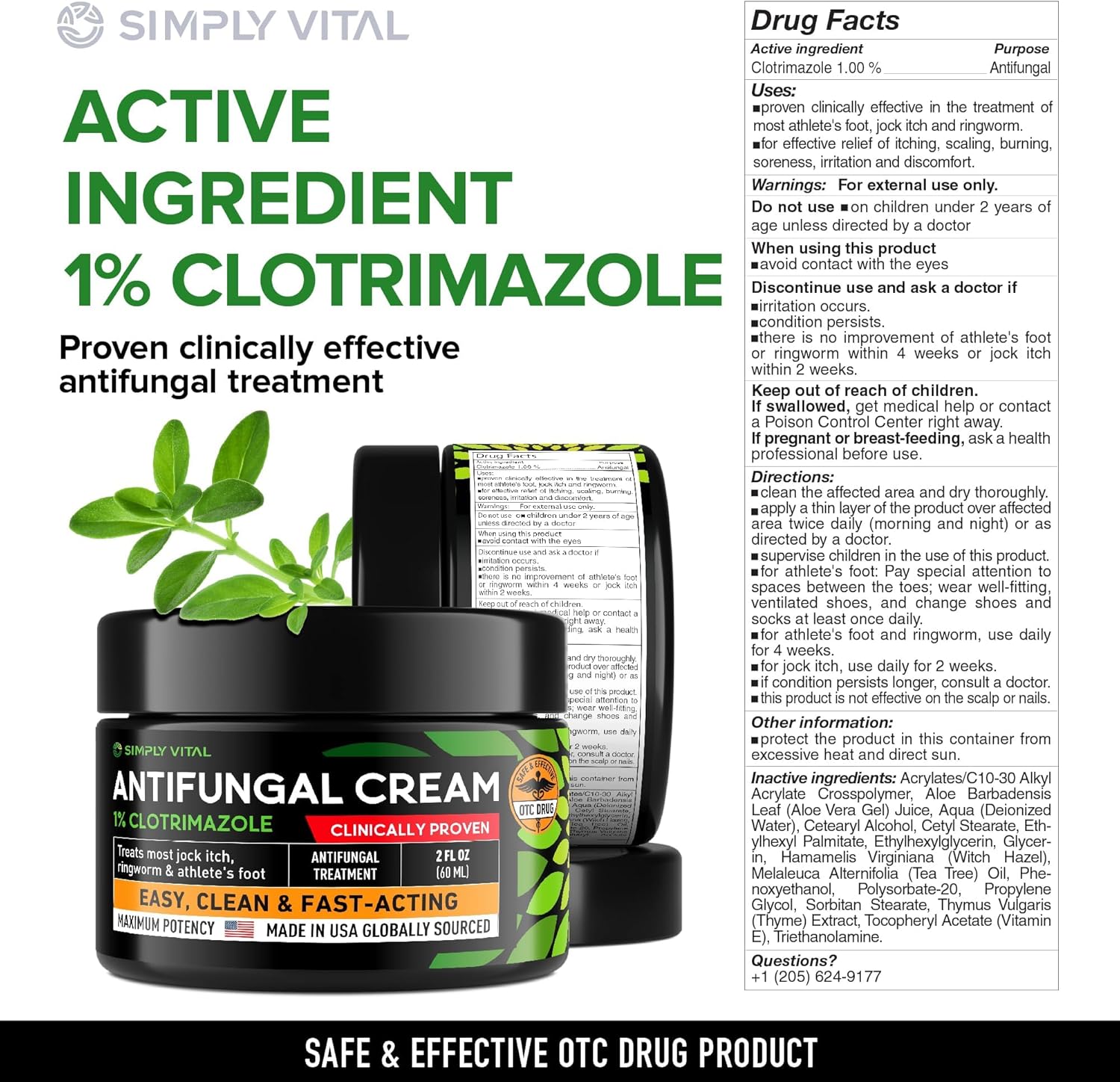 SimplyVital Antifungal Cream with Clotrimazole 1% - Foot Skin Fungus Treatment Extra Strength for Humans - Anti fungal Treatment for Ringworm, Jock Itch & Athlete’s Foot – Made in USA – 2 oz