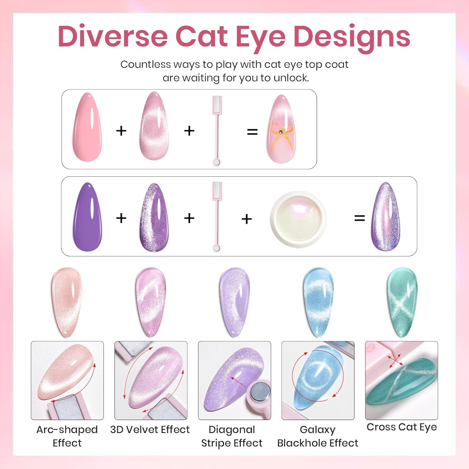 - Included Components : 6pcs glitter gel top coat, cat eye magnet, plastic stick