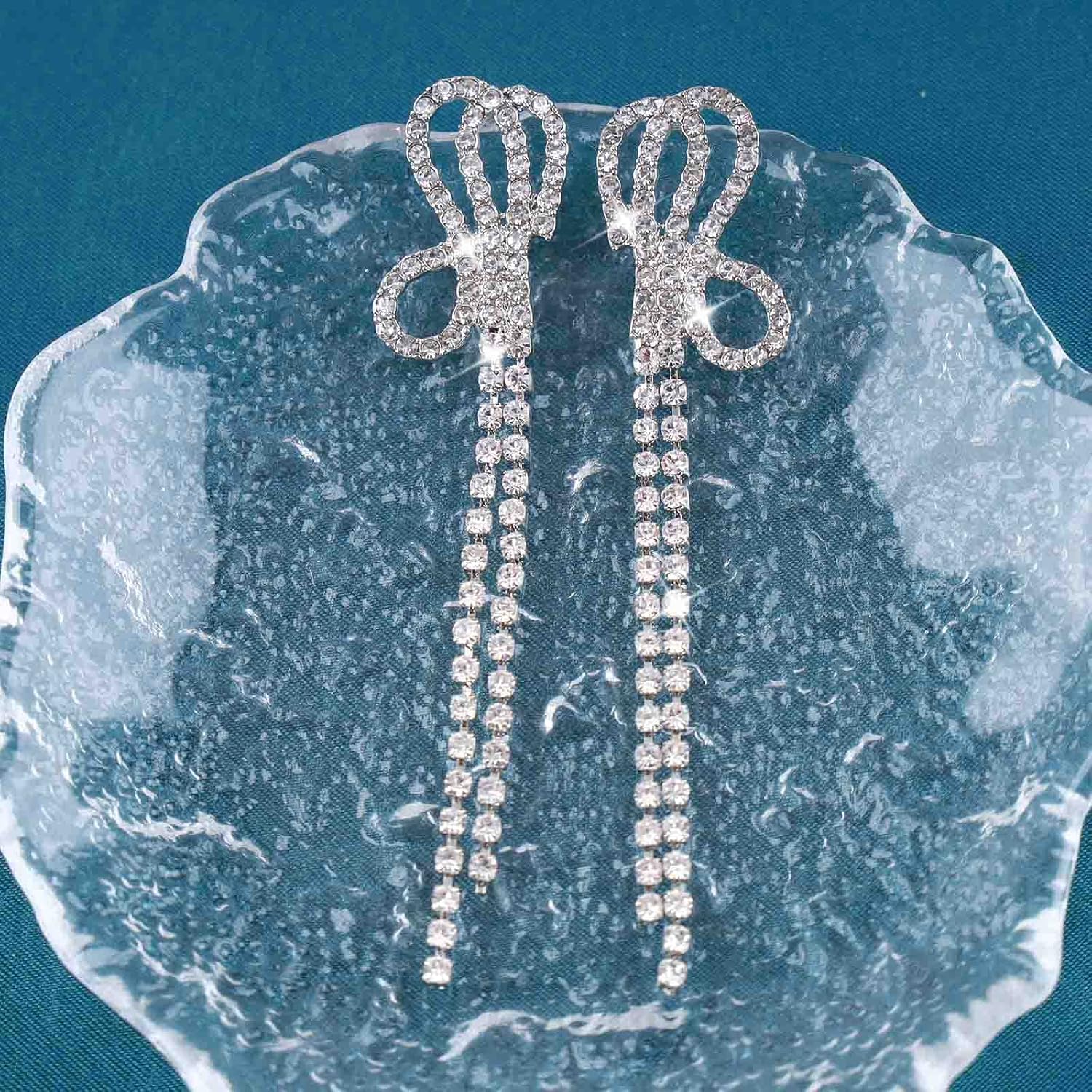 Vintage Crystal Chandelier Drop Earrings Long Rhinestone Chain Earrings Silver Cz Bow Tassel Earrings Sparkly Bridal Tennis Chain Earrings Jewelry for Women