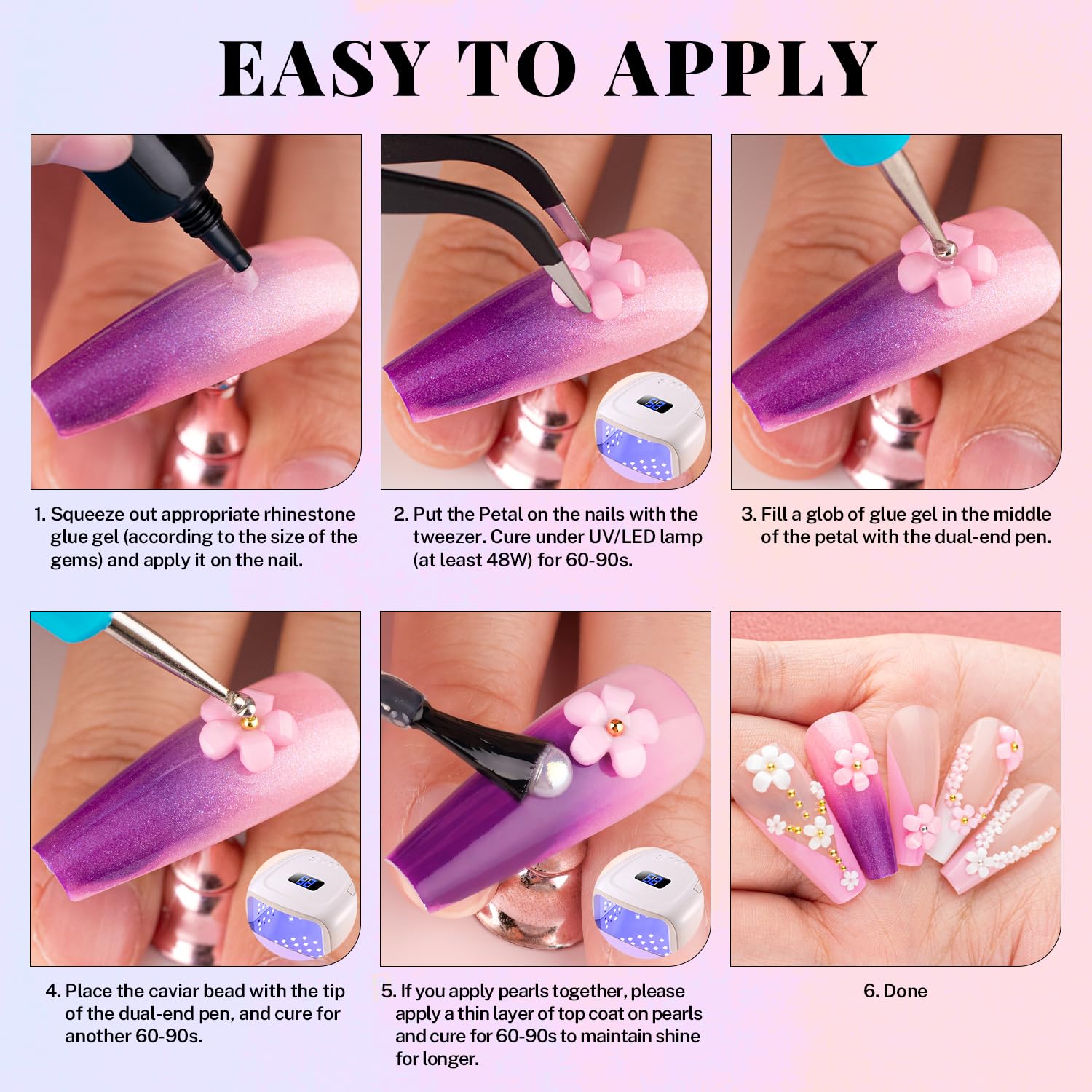 - ๐ADHESIVE GEL GLUE -- The crystal clear nail gem glue uses a special, non-toxic and eco-friendly formula with strong tackiness, adhesion, and fluidity for easily applying decorations. It is a type of UV gel glue. After proper application and curing under a UV/LED lamp, the glue dries clear with superior bonding strength that can last weeks without falling off. With the designed tip, you can easily and conveniently apply the glue to the nail bed or the surface of false nails.