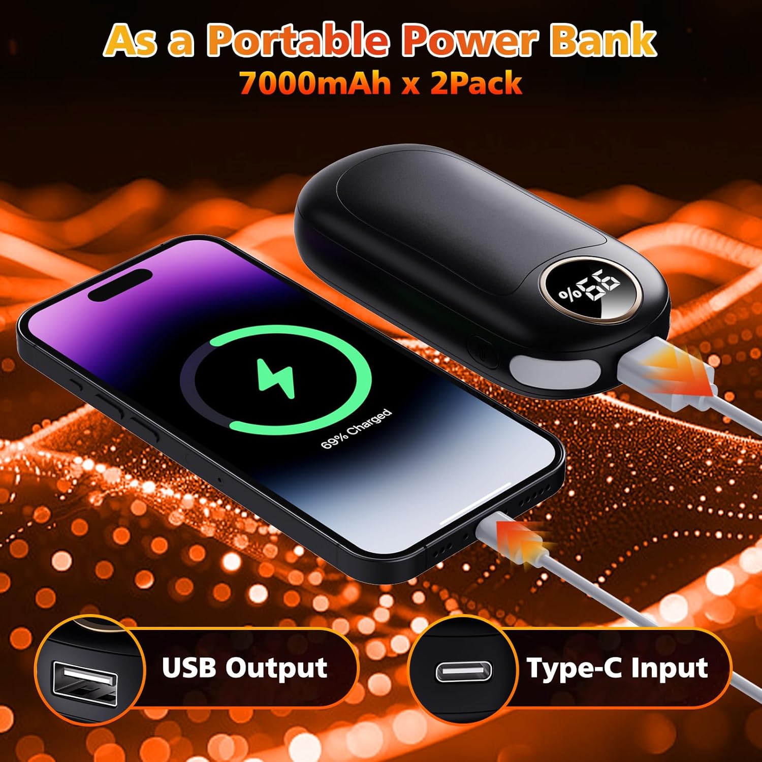 - 【Long Battery Life & Fast Charging】This rechargeable hand warmers total is 14000mAh (7000mAh * 2 Pack) . It can be fully charged in 3.5 hours and can provide up to 20 hours of continuous warmth! When you use single sided heating mode, it can be used up to 18 hours, and when you use double sided heating mode, it can be used up to 8 hours. These come with a Y-shaped charge cable allowing you to charge both using one charging port. Say goodbye to the hassle of frequent charging