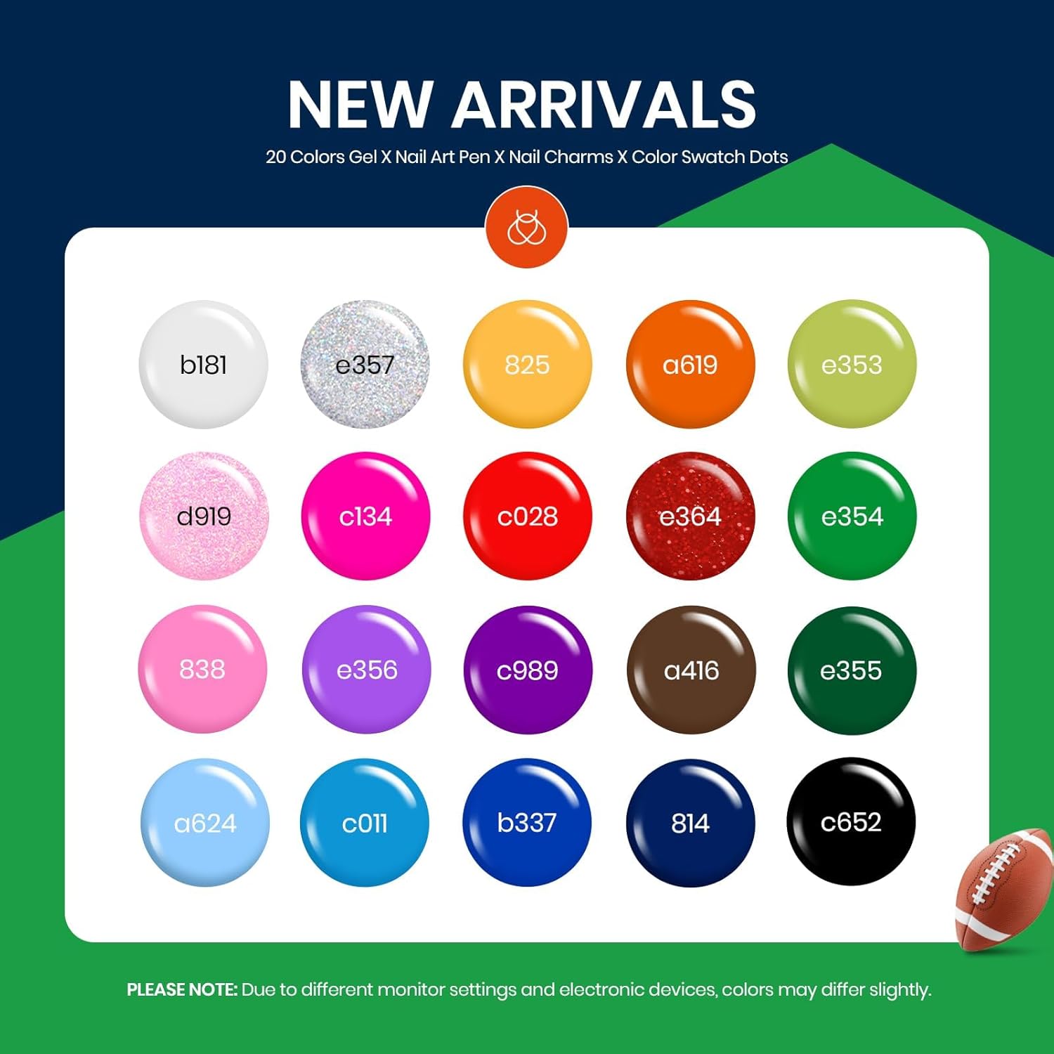 beetles Gel Polish Set, 20 Color Pink Yellow Green Red Blue Gel Nail Polish Blokecore Collection with Sports Nail Charms Base Top Coat and Double-ended Brush DIY Home Rainbow Nails