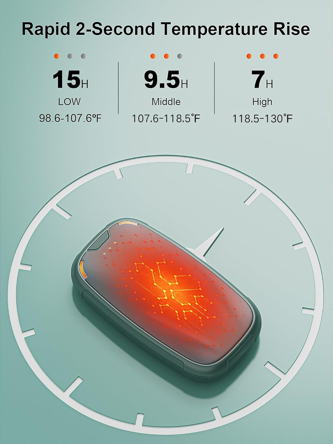 - 【Three Seconds Quick Heat】There is an on button on the top of the electric hand warmers rechargeable, press and hold for three seconds and the reusable hand warmer will turn on the heating to 105.8℉-114.8℉-125.6℉. Adjust the suitable temperature according to different temperature needs.