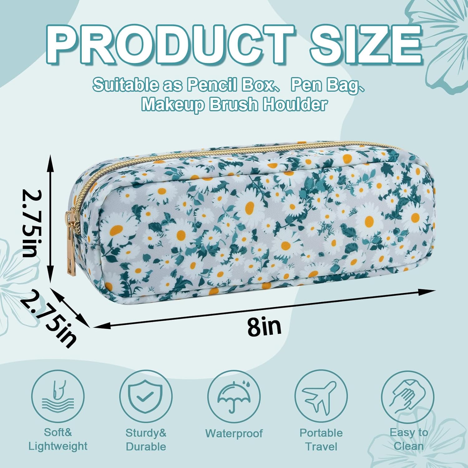 Waterproof Small Floral Pencil Case Makeup Bag for Purse,Cute Flower Pencil Pouch Preppy Nylon Makeup Brush Holder with Zipper,Girls Portable Storage Case for Work(Slim Green-Daisy)
